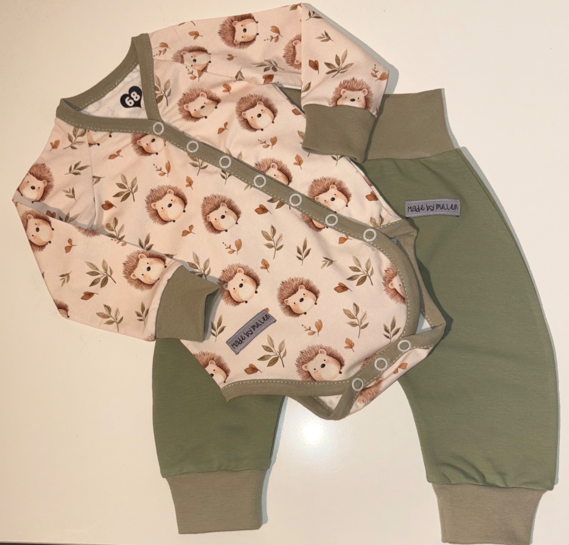 Ett set med en body i trikå med igelkottar på. Byxor i collegetyg till med mudd i midjan.